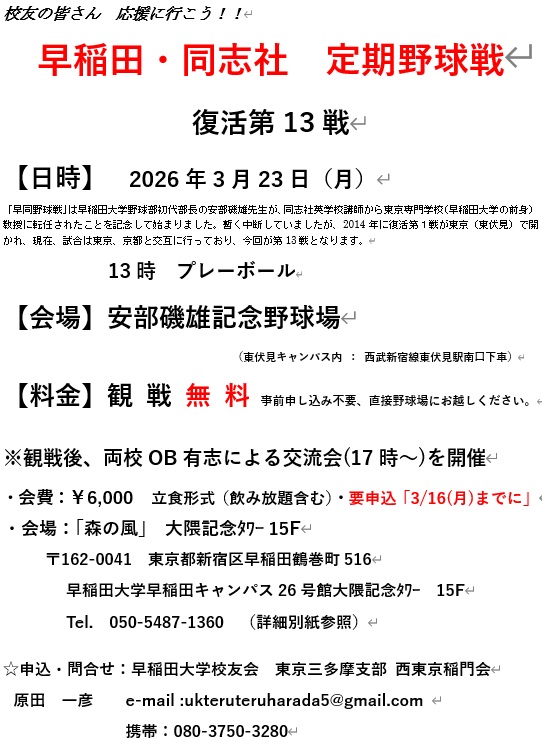 参加申込送付先:西東京稲門会 原田e-mail:ukteruteruharada5@gmail.com 携帯:080-3750-3280